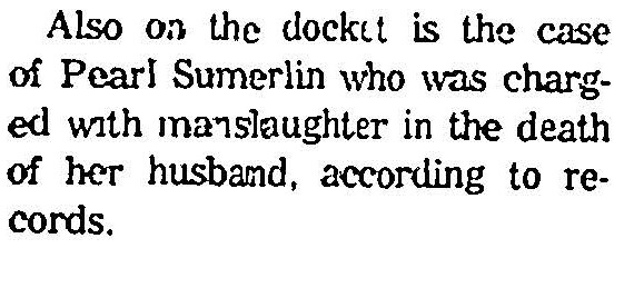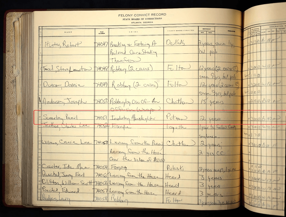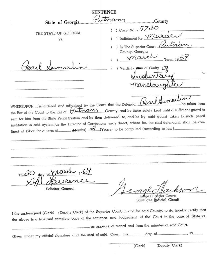 On 20 Mar 1969, Pearl was convicted of involuntary manslaughter and was sentenced to 2 years in the state penitentiary at the Georgia Rehabilitation Center for Women in Hardwick, Baldwin County, Georgia. [Source: Georgia Central Register of Convicts, 1968-1970; Felonies], [Putnam County J.P. Court, 368th District.].