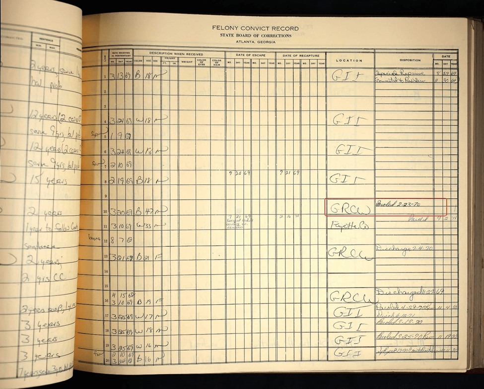 After serving 11 months of her 2-year sentence at the Georgia Rehabilitation Center for Women in Hardwick, Baldwin County, Georgia, Pearl Summerlin was released and paroled on 23 February 1970. [Source: Georgia Central Register of Convicts, 1968-1970; Felonies]