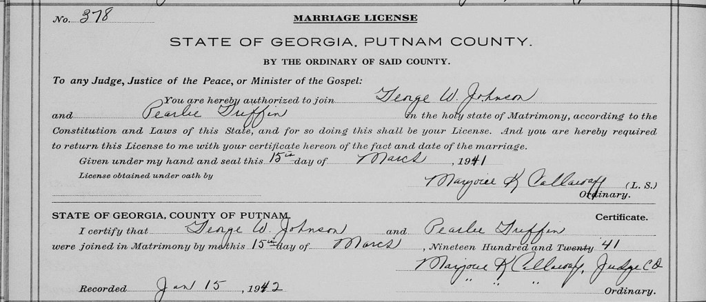 On 15 March 1941, at age 19 Pearl married 22-year-old, George Washington Johnson in Putnam County. He was the son of John L Johnson and Josephine Eubanks Johnson and was also from Putnam County.