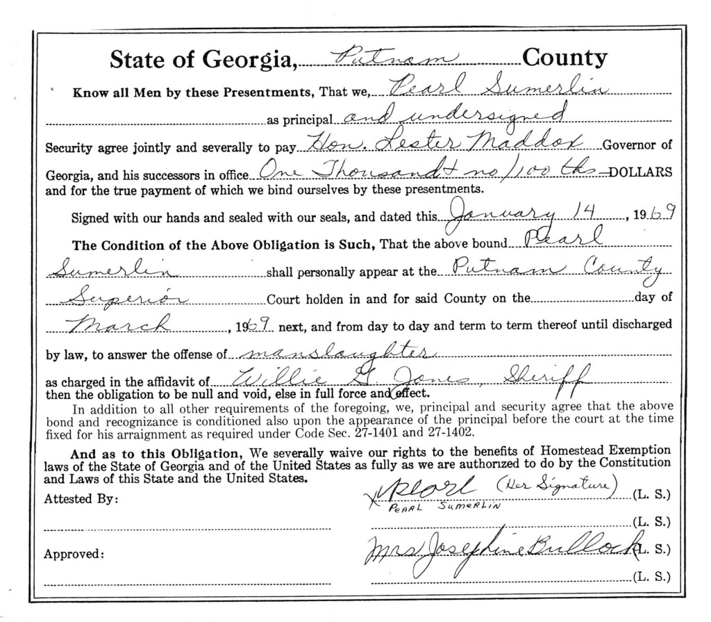 Pearl’s bond of $1,000 was paid by Mrs. Josephine Bullock on 14 Jan 1969. Her trial and sentencing in Superior Court for the reduced charge of manslaughter was to be held in March 1969. [Putnam County J.P. Court, 368th District, G.M.]
