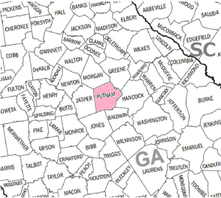 Partial County Map of Georgia showing locations where Ben Lundy and or his parents resided