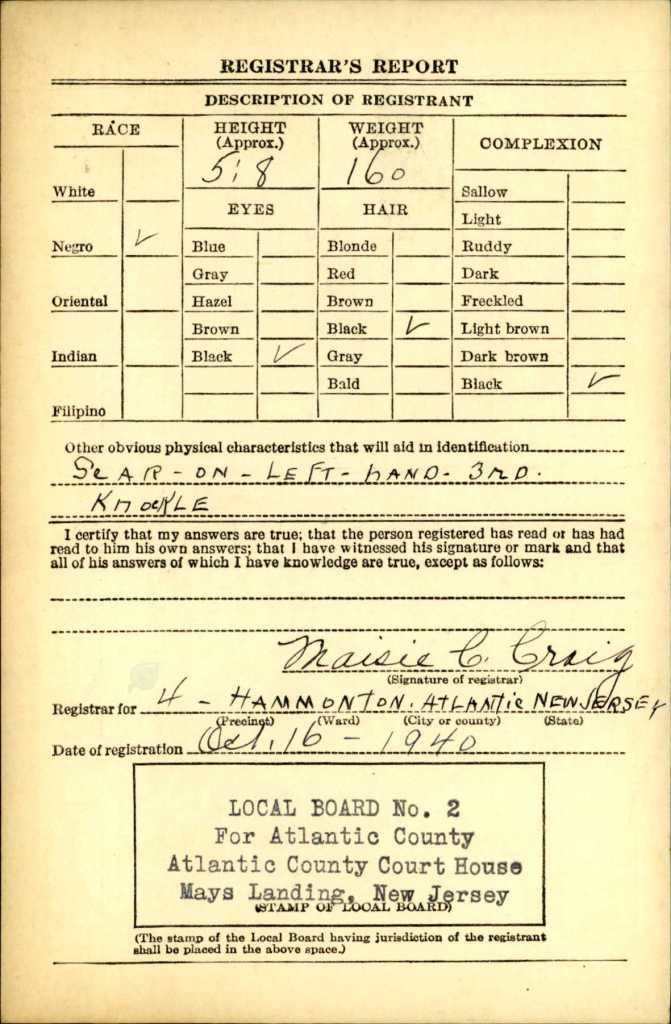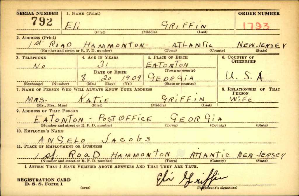 Six months after being recorded on the 1940 federal census in his brother’s house, on 16 October 1940, Eli was residing in Hammonton, Atlantic County, New Jersey when he registered for the WWII draft there. He was 31 years old, and his birth date and birthplace were respectively recorded as 20 Aug 1909 and Eatonton, Georgia. His height was recorded as 5’ 8”; his weight, recorded as 160lbs, his complexion, hair and eye color all recorded as “black”, and it was noted that he had a scar on his left hand, 3rd knuckle. He worked for Angelo Jacobs on First Road in Hammonton. His listed his next of kin as Mrs Katie Griffin, his wife.