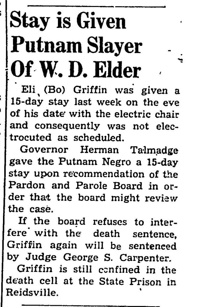 Sadly in 1951, Eli Griffin’s violent pattern escalated for the worse. This time a man was killed and even worse for Eli Griffin, this man was white. WD Elder was a white man in Walton County of good standing in both Putnam County and in his home community of Walton County, Georgia. [Walton Tribune, Page13, 1951-10-03] According to Atlanta Journal published on 21 August 1951, Eli was on parole in 1951 for shooting an Eatonton police officer which likely occured in 1949.