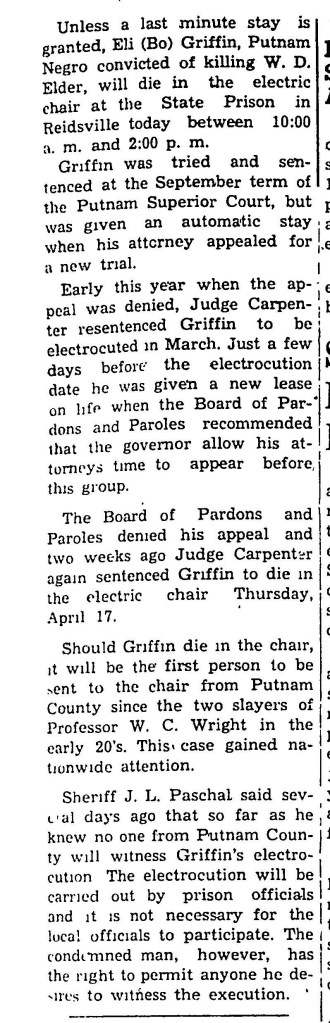 Eli Griffin was one of 218 executed by the state of Georgia between 1941 and 1964. Each of them electrocuted. One of them was a 44 year old Black woman. The rest were 46 white men between 18 and 54 years old and 171 Black males between the ages 16 and 72. [DeathPenaltyUSA, Index by State – GEORGIA – 1941-1964]