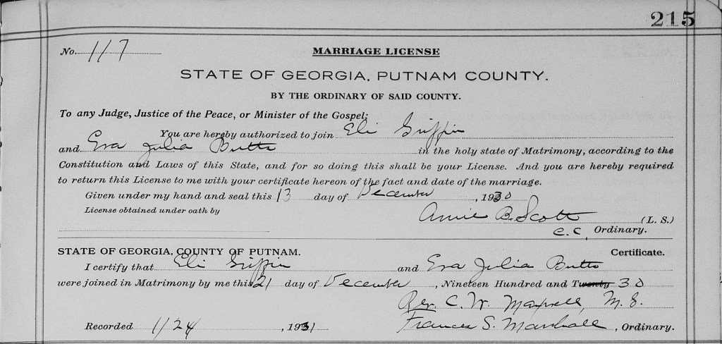 Marriage Certificate of Eli Griffin and Eva Julia Butts [Putnam County Marriages, Vol M, page 215]